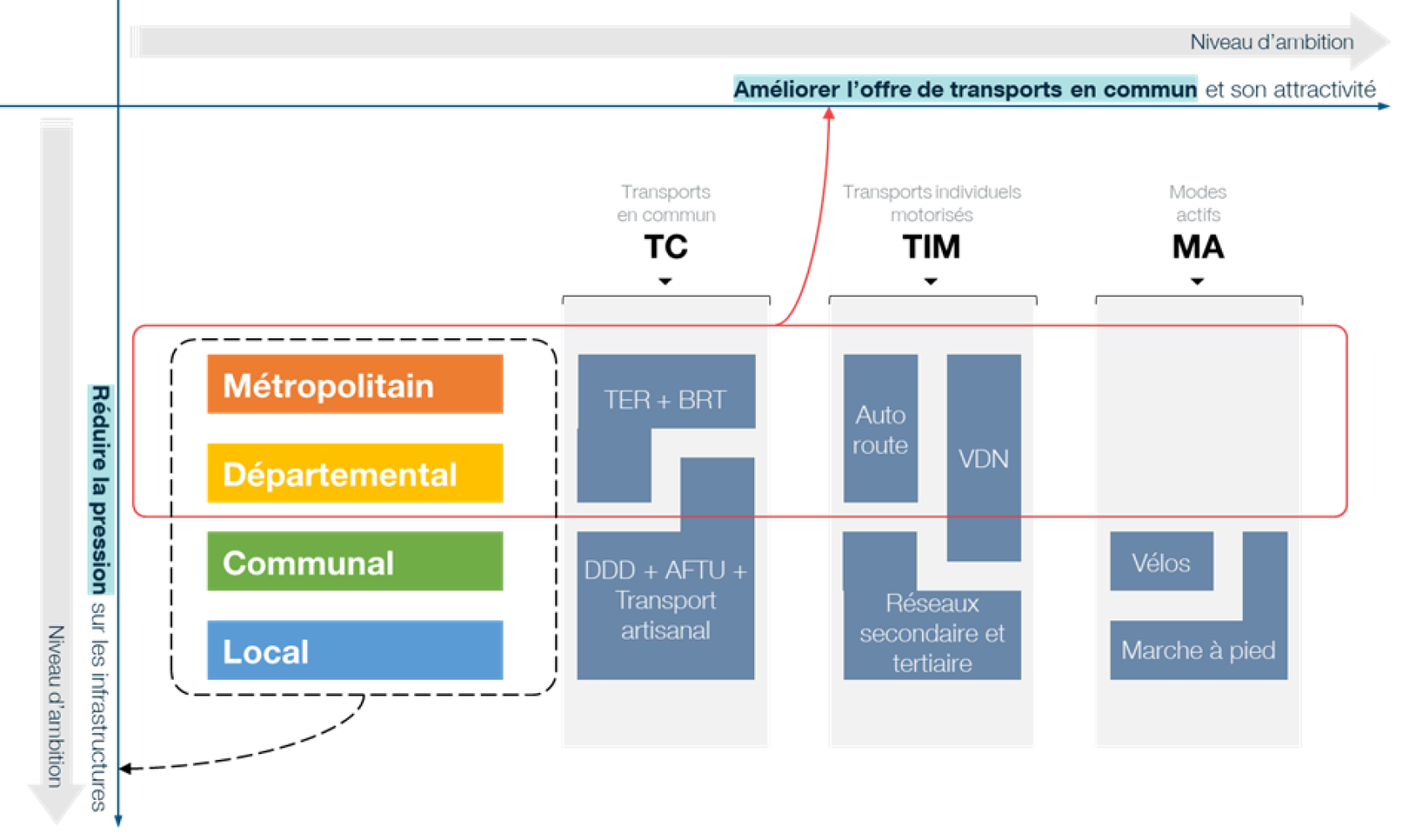 Un premier scénario visant à une forte amélioration de l’offre de transport collectif envisage la mise en place progressive d’un réseau ambitieux de TCSP. A partir de celui-ci, un réseau hiérarchisé de voirie est projetée, tant pour les zones déjà urbanisées que pour les zones où l’objectif est d’anticiper la croissance de la ville. Selon ce scénario qui représente déjà des efforts importants, l’offre en TCSP et celle intégrée dans la circulation générale (transports individuels et transports collectifs) parviennent à peine à répondre aux besoins de mobilité urbaine de Dakar en 2035. Pour améliorer les conditions futures, il semble nécessaire de réduire la pression sur le système.