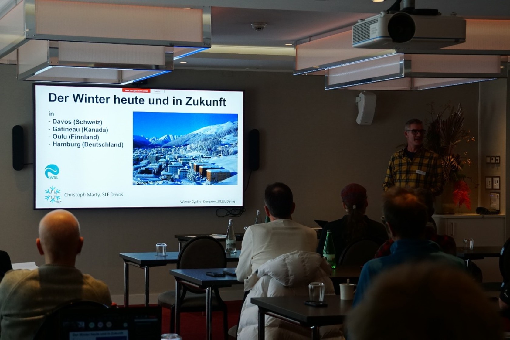 L’évènement a été marqué par la participation de plusieurs experts renommés, chacun apportant une perspective unique sur la pratique du vélo par temps froid. Parmi les intervenants, nous avons eu le privilège d'entendre Nadine Lafond de Gatineau au Canada et Pekka Tahkola d'Oulu en Finlande partager leurs expériences sur la pratique du vélo en hiver dans des climats plus ou moins similaires. Britta Peters de Hambourg, Allemagne, a présenté ses recherches innovantes sur l'utilisation d'alternatives au sel pour le déneigement, offrant ainsi des solutions plus respectueuses de l'environnement. Christophe Marty du SLF (Institut pour l’étude de la neige et des avalanches ) a comparé les situations climatiques de ces quatre villes - Davos, Oulu, Gatineau et Hambourg - et a exploré l'impact du réchauffement climatique sur les hivers à venir.
