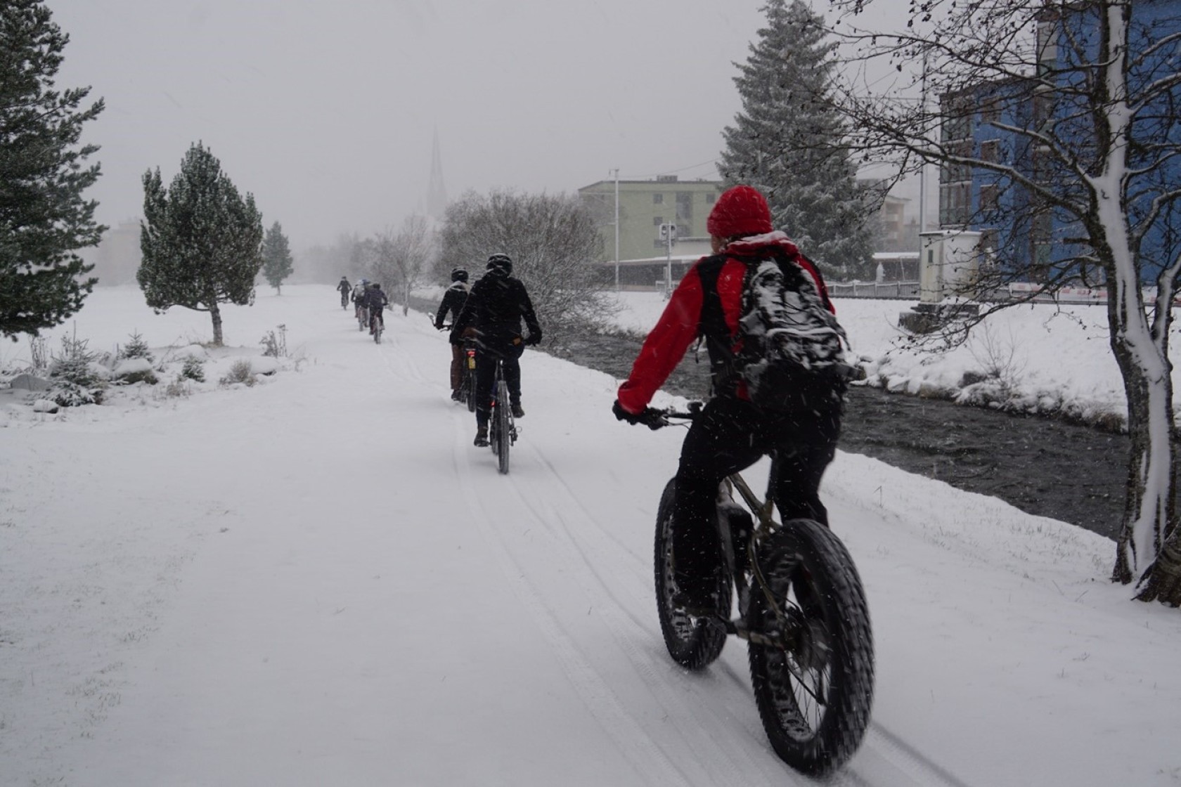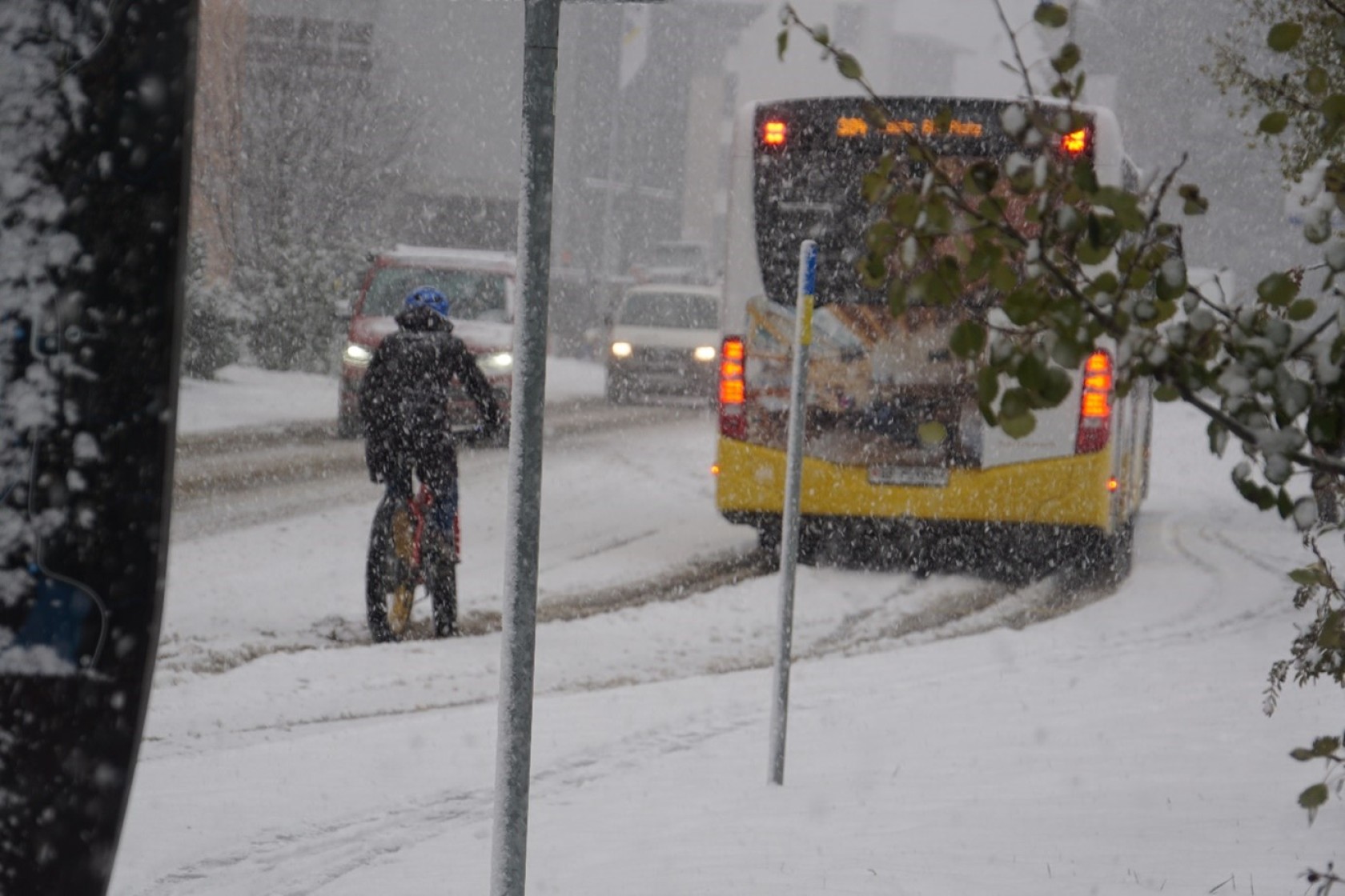 La journée a débuté par un tour à vélo dans Davos sous de fortes chutes de neige, conditions parfaitement en lien avec la thématique, mettant en lumière les défis spécifiques auxquels les cyclistes font face pendant l'hiver. Cela a offert une occasion unique d'explorer les infrastructures de Davos, identifier leurs enjeux, et d'aborder la question cruciale du déneigement !